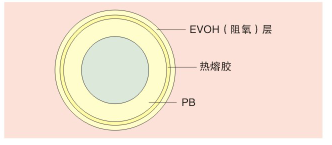 联塑PB(阻氧)采暖管采用三层共挤技术,在普通PB管材外表均匀涂覆一层热熔胶和EVOH(阻氧)层,能够有效阻隔氧气进入热循环系统,减少设备的腐蚀。阻氧管结构如右图所示,产品的透氧率满足德国标准DIN4726-2008对采暖管道的阻隔性要求。